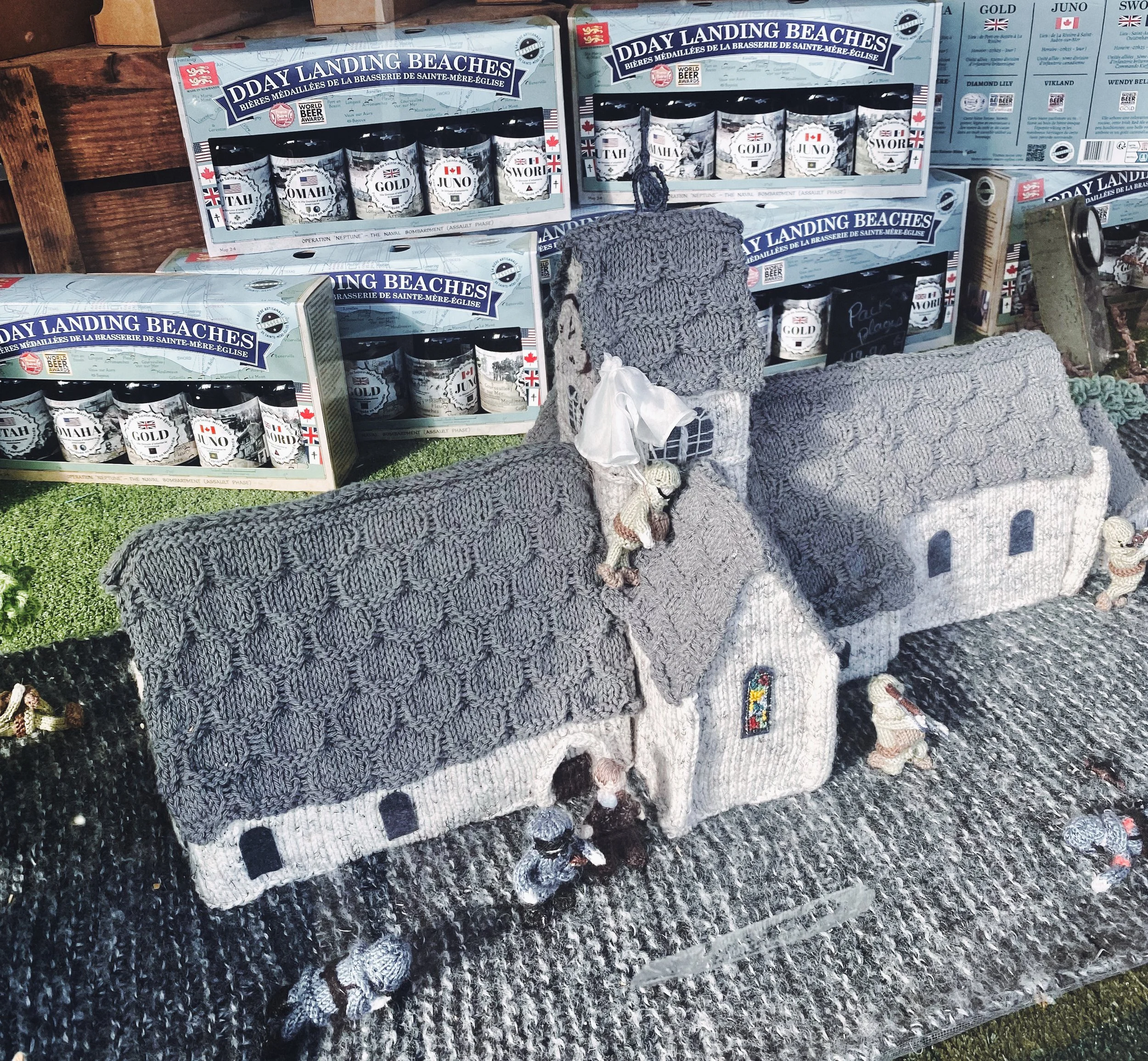 It was Sainte-Mère-Église that left me really scratching my head though. The scarecrow hanging from the spire was odd. But the yarn-bombed scene of a woolly church (with a woolly parachutist hanging from the spire) and little grey wool Nazis shooting at little woolly American paratroopers in the window of a local shop struck me as deeply strange. Behind the yarn-bombed scene from The Longest Day, there were presentation boxes of five bottled jams named after the D-day landing beaches: Utah, Omaha, Gold, Juno and Sword.